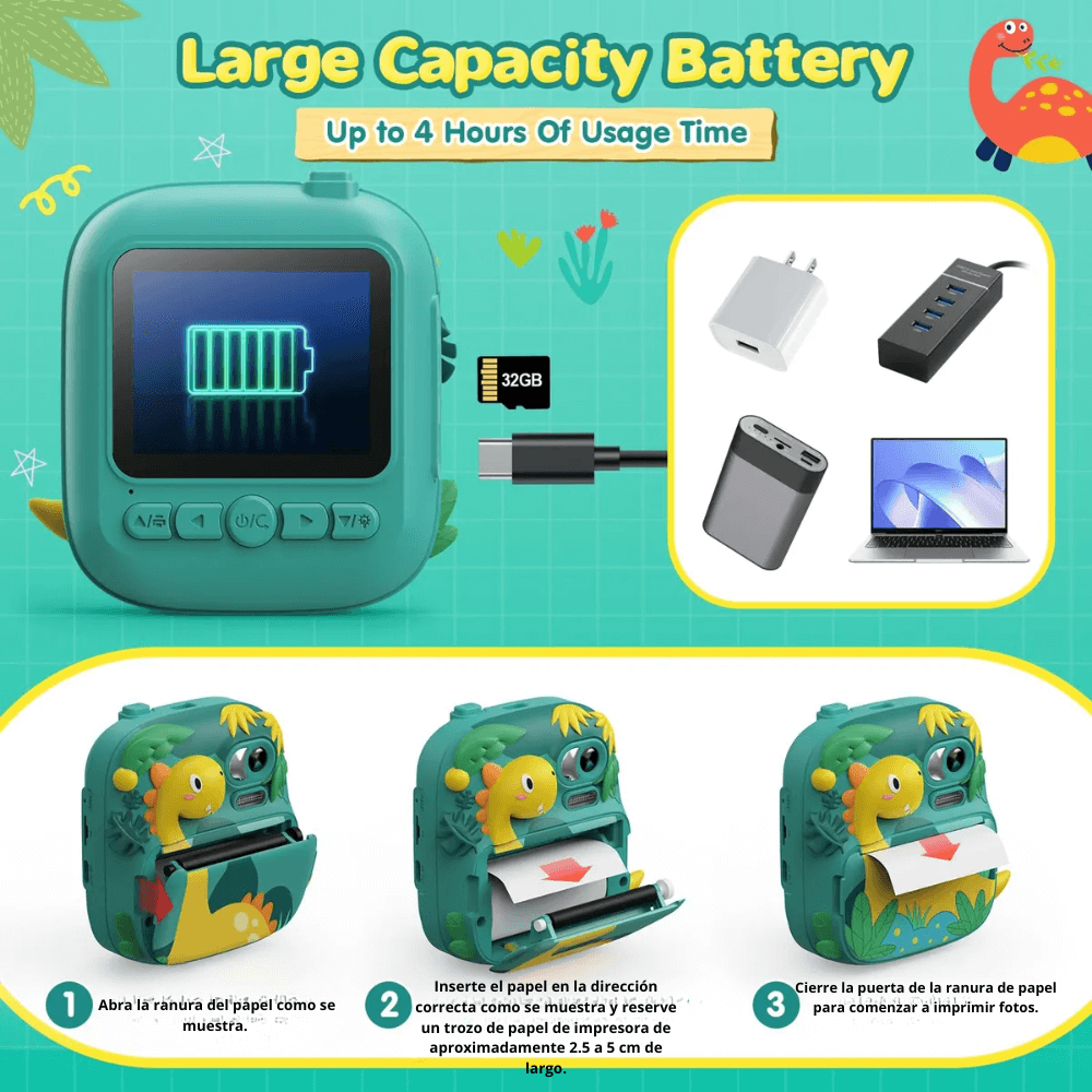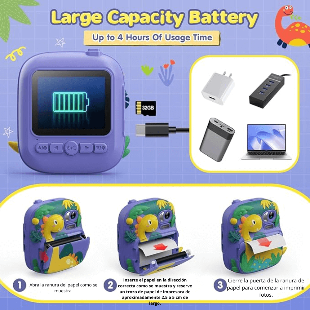 Captura cada sonrisa y momento especial con esta divertida cámara diseñada especialmente para niños. Su sistema de impresión térmica instantánea permite imprimir fotos en cuestión de segundos sin necesidad de tinta, lo que la hace segura, limpia y muy fácil de usar. Los niños podrán disfrutar de la experiencia de tomar fotos, ver sus creaciones y tenerlas en papel al instante para colorearlas o decorar su habitación.