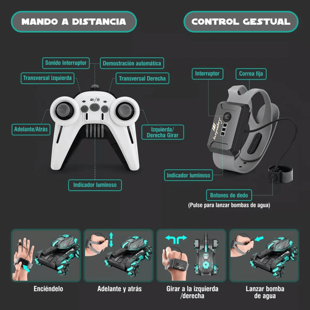 Este tanque cuenta con doble sistema de control: mando tradicional y sensor de mano para movimientos intuitivos. Sus ruedas multidireccionales permiten giros y desplazamientos ágiles en cualquier dirección.