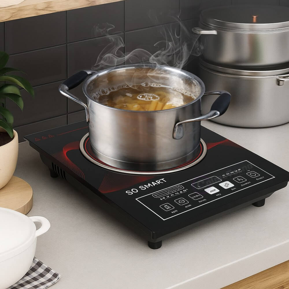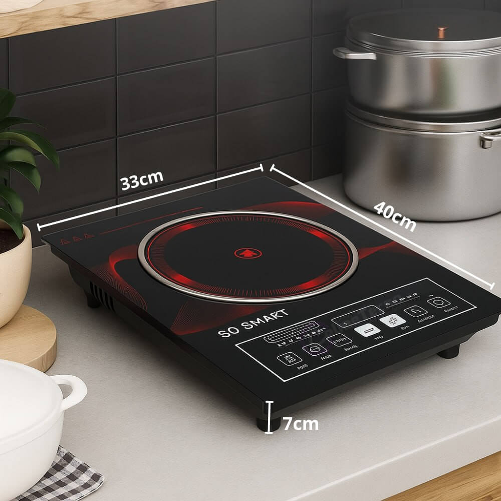 Su diseño portátil y liviano la hace perfecta para cocinas pequeñas, apartamentos, estudios, viajes o incluso para uso profesional en negocios de comida rápida. No requiere instalación, solo conectarla y empezar a cocinar. Es compatible con ollas y sartenes de fondo plano de acero inoxidable o hierro fundido, optimizando el rendimiento y asegurando una cocción uniforme.