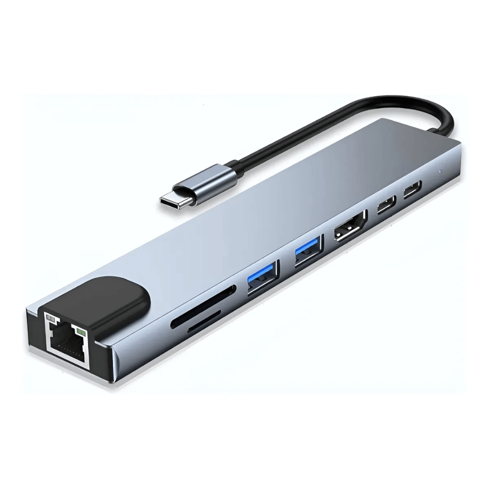 HUB Adaptador Multipuerto 8 en 1 para MacBook y Portátil con conexión puerto Usb Tipo C (Thunderbolt 3) HDMI Salida Audio y Video Calidad 4K, Ethernet RJ45, Usb Tipo A, Usb Tipo C Datos y Carga.