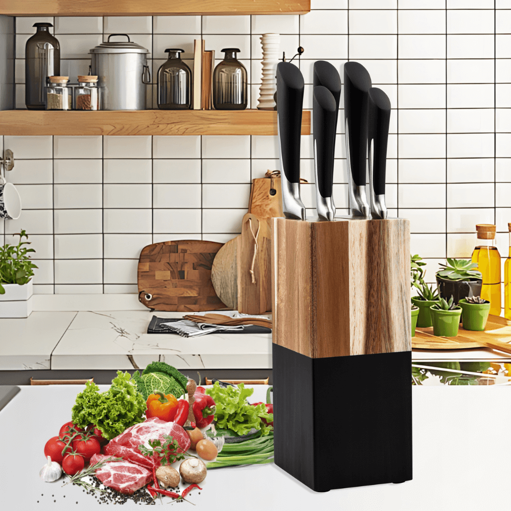 Base de Bambú y Acero: Mantiene los cuchillos organizados, protegidos y siempre a la mano.
