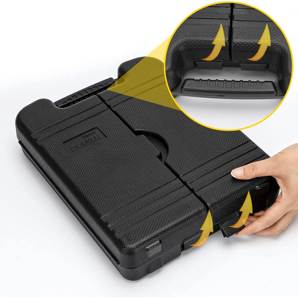 Almacenamiento portátil organizado: cuenta con una caja de transporte resistente con compartimentos seguros que mantienen las herramientas protegidas y ordenadas sistemáticamente. La carcasa reforzada permite un transporte sin esfuerzo a cualquier lugar de trabajo mientras mantiene una organización sin desorden y un cómodo almacenamiento posterior al uso.