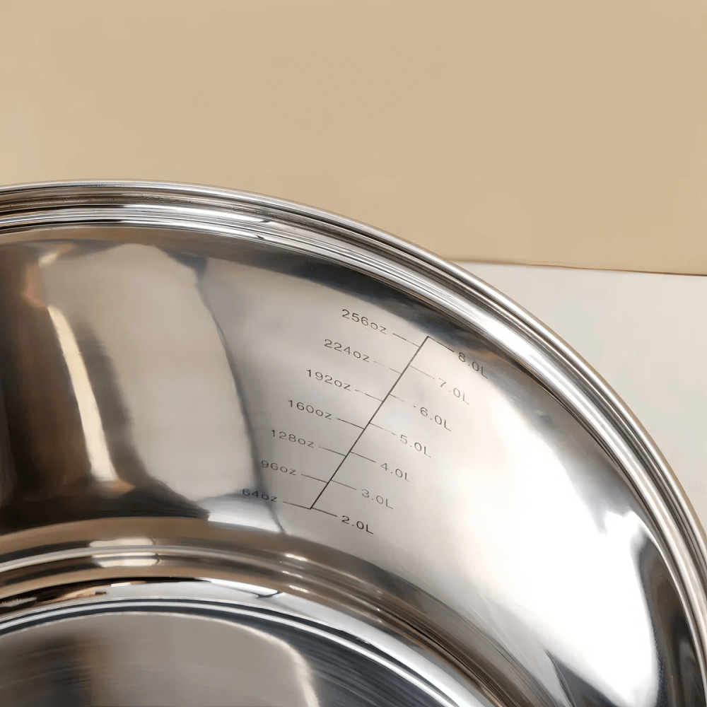 Material de alta calidad: acabado profesional de grado alimenticio y artesanía de acero inoxidable. Cada superficie expuesta al agua y las partículas de alimentos está certificada como segura de grado alimenticio. Libre de PFOA, PFAS, plomo o cadmio, la superficie de cocción pulida nunca se oxida y reacciona con los alimentos o altera los sabores.