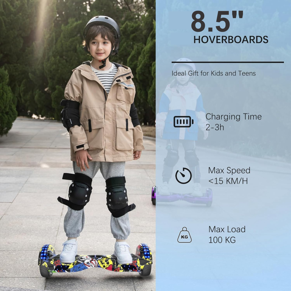 HOVERBOARD DE CONDUCCIÓN SUAVE: viaja con estilo con el Hoverboard eléctrico. Ruedas de 8.5", potente motor de 400 W (200 W x 2) y suficiente torque para subir pendientes de hasta 15 grados con facilidad. Este patinete eléctrico puede alcanzar una velocidad de hasta 15km/h y un rango de alcance de hasta 8km.