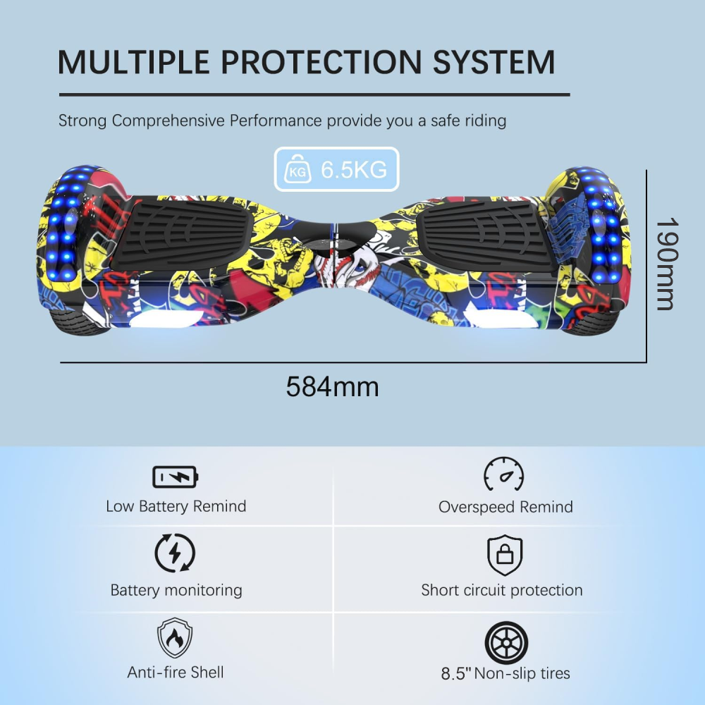 NOS TOMAMOS LA SEGURIDAD EN SERIO: el hoverboard envía alertas si vas a exceso de velocidad o si conduces sobre superficies inseguras para que puedas reducir la velocidad y evitar accidentes. Las luces LED en ambos lados del hoverboard aumentan la visibilidad de cualquier conductor cuando más importa.
