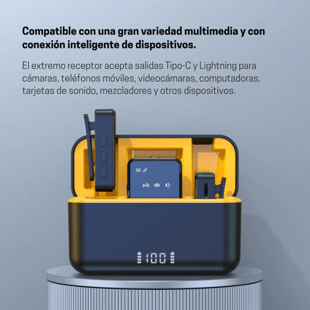 Este set incluye dos micrófonos inalámbricos con clip tipo solapa y un receptor compatible con dispositivos Android (Tipo C) y iPhone/iPad (Lightning), ofreciendo gran versatilidad para conectarlo de manera sencilla a tu celular, tablet o dispositivo sin necesidad de adaptadores adicionales.
