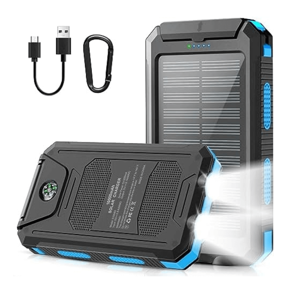 Doble USB y potente luz LED: Hace que sea fácil cargar dos smartphones simultáneamente o una tableta a toda velocidad. Las luces LED se pueden utilizar como linterna con modo estroboscópico de SOS. Cinco indicadores piloto muestran el estado de carga del cargador de batería oportunamente. La luz verde se enciende cuando se está cargando con luz solar y la luz azul se enciende cuando se carga por USB.