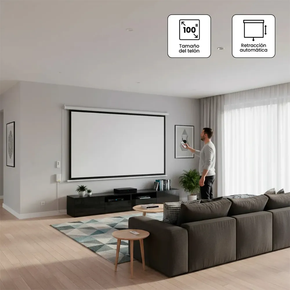 Este telón motorizado de 100 pulgadas es ideal para quienes buscan una experiencia de cine en casa, uso profesional o presentaciones de alta calidad. Compatible con proyectores HD, Full HD y 4K, ofrece una imagen nítida, uniforme y con excelente nivel de contraste.