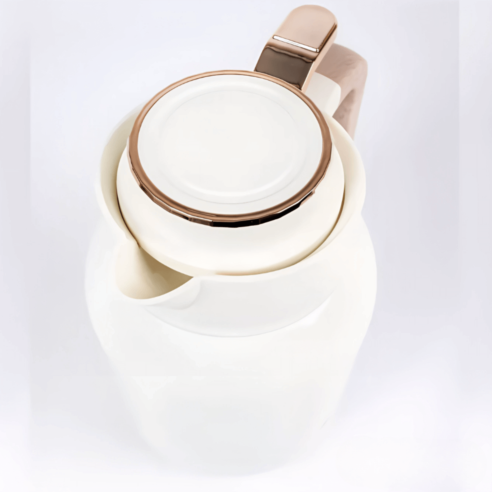 Su diseño ergonómico con mango efecto madera y acabado exterior gris oscuro brillante lo convierte en un complemento sofisticado para tu cocina, oficina o reuniones familiares. Además, su tapa hermética con sistema de vertido preciso evita fugas y mantiene el contenido seguro en todo momento, incluso durante los desplazamientos o en viajes largos.